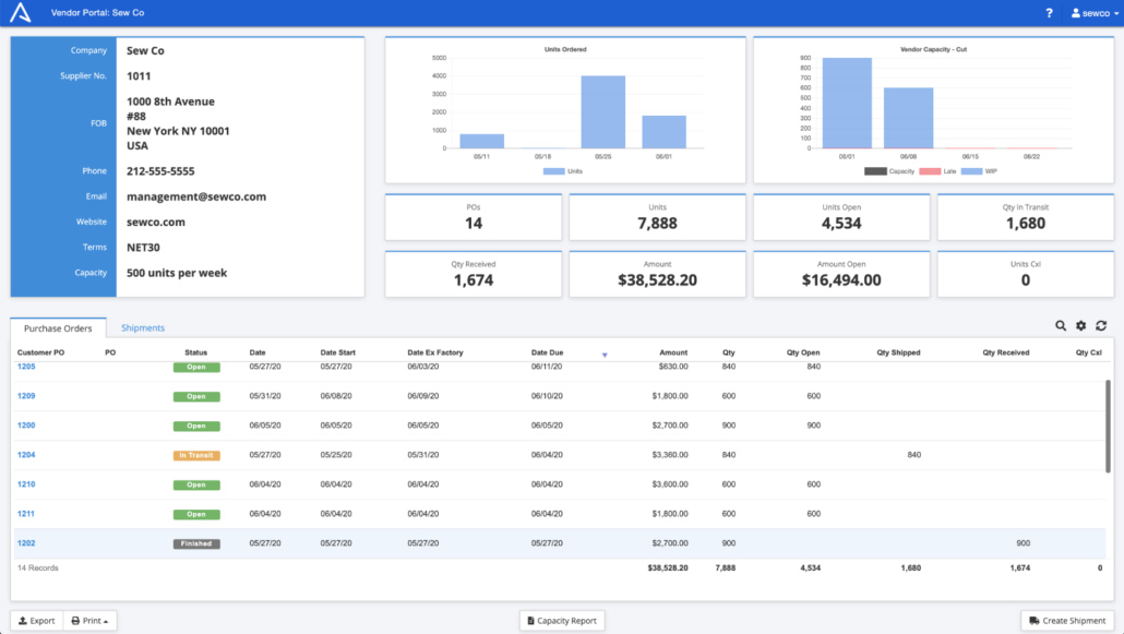 Use ApparelMagic's capacity planning tools to manage orders and due dates for even higher efficiency. POs and work orders are automatically sent to your vendors, and vendors can create shipments within ApparelMagic as soon as they're ready to send.